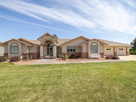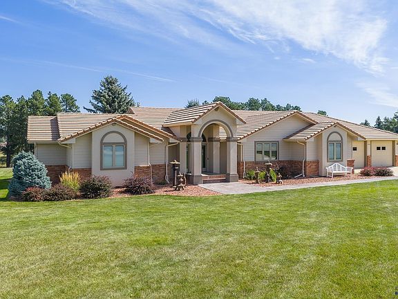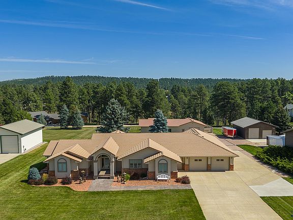 This elegant, SINGLE-LEVEL, home is situated on a spacious 1.05-acre lot in the picturesque Black Hills at South Canyon Country Estates! Located just 10 minutes from Rapid City, you have close access to amenities while being right in the midst of all the hills have to offer! The property offers a 64x26 finished, detached building with a 13' opening (with it's own furnace) for endless options- woodworking, auto work, storage, crafts, gym, man-cave, she-shed, you name it! In addition, there is an 18x12 quality built shed and a private fenced, 4000sq foot area out back. In this coveted subdivision, they have excellent water and a clubhouse, playground, tennis & pickleball courts, and newly refurbished pool for residents' enjoyment! The beautiful, 3224sq ft home exudes a timeless elegance and attention to detail with its high-end materials and quality design. Inside, the home features an open floor plan that seamlessly connects the living spaces, creating a sense of flow & functionality. The open-concept kitchen/dining/lounging provide a spacious area for family gatherings or entertaining. Granite countertops, custom cabinetry, gas fireplaces, natural lighting, & custom built-ins are sure to impress. Through French doors across from the kitchen you'll find a sizeable office room with large window for beautiful views while you work. Don't forget the 24x18 theater room with built-ins- perfect for family night movies! Off the theater room you'll find sliding glass doors out onto your 580sq. ft, private back patio. Get ready in your Master suite with double vanities, zero-entry tiled shower, heated floors, walk-in closet with built-ins and views of the pine trees out back. Another bedroom and & full bath finish out this side of the home. On the other side is the 3rd bedroom & full bath for visiting guests. Your main-floor laundry is near the entry to the 6-car garage which is in tip-top shape with hot & cold water, furnace, finished poly floor & floor grates.(cont.)