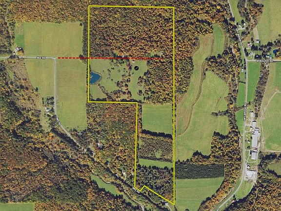 We are pleased to present a hidden gem property with all the makings of multiple uses of hunting, recreation, building, and farming. Just minutes east of Jamestown between Falconer and Kennedy, NY, this property is nicely tucked away on the higher elevation portion of Mee road. This property is largely constructed of 60 acres of woods, with pines and hardwoods with 39 acres of tillable/pasture ground comprising three main fields. Although there is road frontage on Mee road, the access is convenient on a deeded right of way that was once an old town road. The road leads to a gated entrance and ends at the cabin. Along the road a large metal barn and building lot will present themselves on the north side of the road and a pond is on the south side of the road for a second building location. Either spot is perfect for a camper trailer if building is not in your plans. The cabin is a two room building where many hunts and holidays weekends have been enjoyed. A groomed yard with planted trees is also a part of the cabin area. The property exhibits signs of a large population of deer, with multiple trails and access throughout the property via ATV. There are 10 hunting blinds included in this sale and they are all strategically located overlooking fields, pine groves and transition areas for success. The fields are currently in pasture and hay, but any one of them can be improved with a food plot and are easily accessed from the main roads coursing through the property. There is one gas well on the property and GMO's will convey to the purchaser. Priced well to sell, call us today! ADDITIONAL INFORMATION: GMO's convey, Cabin, Deer hunting, 10 blinds, Fields, Food plots, Pond, ATV trail access, Barn, Building lots, Electric at the road, no wetlands, Views, Taxes TBD, 2.8 miles to Little Valley, NY, 2.4 miles to Cattaraugus, NY, 3.6 miles to Falconer, NY, 5.4 miles to Jamestown, NY, 7.8 miles to Randolph, Sold AS IS.