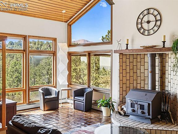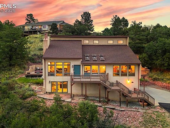 Nestled in the desirable Oak Hills neighborhood in Northwest Colorado Springs, this one-of-a-kind home offers breathtaking mountain, city, and bluff views from every window. Set on over an acre, the property delivers more than 1,200 sq ft of deck and patio space for the ultimate Colorado outdoor living experience. Inside, the main-level master suite features a spacious 5-piece bath, walk-in closet, and direct access to its own private deck with hot tub. A newly converted office with skylights and fresh finishes showcases dramatic mountain views, while a striking living room with fireplace and hand-painted tile floors by a local artist serves as a centerpiece. The expansive dining room and open kitchen with island, stainless steel appliances, and breakfast nook flow seamlessly to the deck for outdoor dining or entertaining. A family room with a wall of windows frames the sweeping vistas, creating an ideal gathering space. Upstairs, a versatile loft with private deck and adjacent ¾ bath is perfect for guests, an office, or playroom, and is complemented by two bedrooms, a full dual-vanity bathroom, and a charming reading loft. The oversized heated garage features its own zone and tall door for a conversion van. The walkout basement offers a spacious rec room with wet bar, projector screen, bedroom, ¾ bath, and large wine cellar/storage room. Updates include a new boiler (Sept 2024), newer mini-split A/C (2021), stucco exterior, and fresh touches throughout. With its rare privacy, custom floorplan, and resort-like feel, this home evokes the charm of a mountain retreat while being just minutes from I-25, shopping, hiking and biking trails, schools and parks. Located in award-winning Academy District 20, this home combines unique character with unmatched convenience. Don’t miss your chance to experience this extraordinary property—schedule your private showing today!