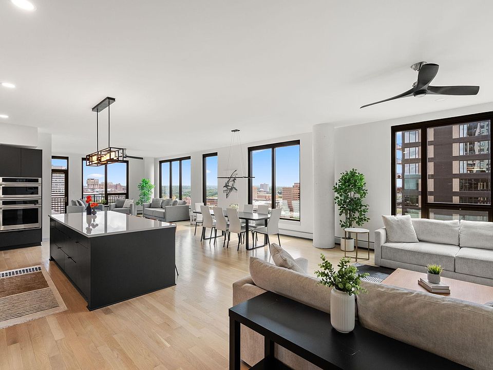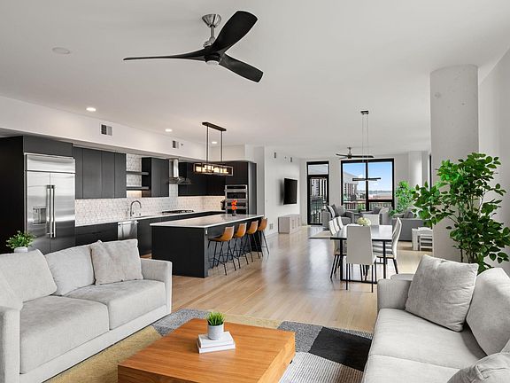 Experience urban living at its finest in this expansive top-floor residence at Legacy Lofts, offering sophisticated design and thoughtful upgrades throughout. With West and South exposures, this rare 3-bedroom, 3-bath corner unit is flooded with natural light and showcases stunning city views. Designed for both comfort and entertaining, the home features two spacious living areas, each ideal for gatherings or quiet relaxation. The open-concept main living space highlights floor-to-ceiling windows, a custom built-in dry bar, and seamless flow between the kitchen, dining, and entertaining areas. The chef’s kitchen is a true showpiece, anchored by an oversized island with quartz countertops, a custom tile backsplash, GE Monogram appliances, upgraded cabinetry, and designer lighting. Generous bedrooms are thoughtfully set apart from the main living areas for privacy, including the serene owner’s suite with oversized walk-in closets and a spa-like en suite bath. Additional custom touches throughout include walnut flooring, enameled woodwork, custom paint, luxury lighting, and built-in closet systems. Unique finishes, high-end selections, and meticulous attention to detail set this residence apart from the rest, an exceptional opportunity to own one of the most desirable homes in the building. Indulge in a full suite of resort-inspired amenities, from the rooftop deck with lawn bowling to the outdoor pool, hot tub, and sauna. Stay active with a state-of-the-art fitness center, game room, and golf simulator, or unwind in the elegant community room. Additional conveniences include 24-hour onsite staff, secure entrances, underground parking with controlled access, onsite storage, a pet grooming spa, car wash, and more. Residents also enjoy unique building features such as two conference rooms, rotating art exhibits, a library, and an onsite gated playground. All just steps from Gold Medal Park, US Bank Stadium, riverfront trails, the Guthrie Theater, and the city’s finest dining—offering a lifestyle of true sophistication in the heart of downtown.