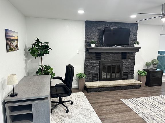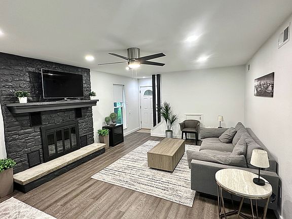 The bedrooms have queen beds and walk-in closets, primary suite has an extra large space. The main living area is set up comfortably and includes a desk space for remote workers. The one car garage offers secure storage and is where the washer/dryer are located. The back yard is completly fenced-in with side gate. Pets negotiable.