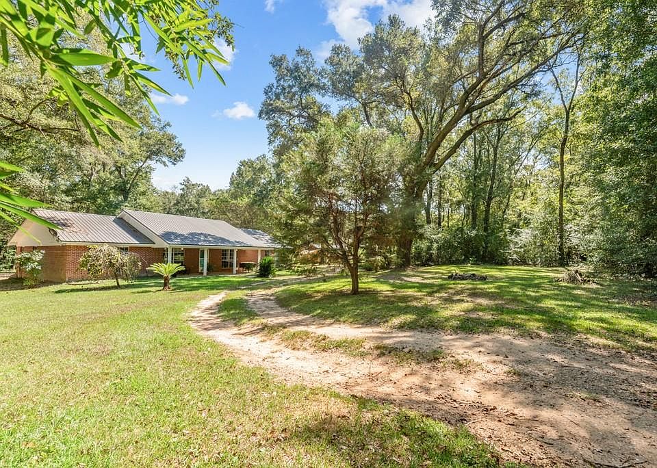 Tucked away at the end of a private road, this 4-bedroom, 3-bath brick home sits on almost 6 peaceful acres—offering the perfect mix of privacy and convenience just minutes from shopping and I-10. Inside, you'll find a freshly painted interior with crisp white trim, creating a bright and welcoming atmosphere throughout. The open floor plan features split brick and laminate flooring for easy maintenance, and the spacious living area flows into a sunroom that overlooks the backyard. The kitchen offers a generous pantry and peaceful views of the butterfly garden from the window. The primary suite includes a huge walk-in closet, while the fourth bedroom—with its own private entrance—is ideal for a home office, in-law suite, or guest space. An oversized utility room includes a built-in desk, perfect for crafting or working from home. Outside, enjoy open green space, mature trees, and included chicken coops ready for your backyard flock. Don't miss this rare opportunity for quiet country living with city convenience nearby. Schedule your showing today! All information deemed to be accurate, buyer to verify