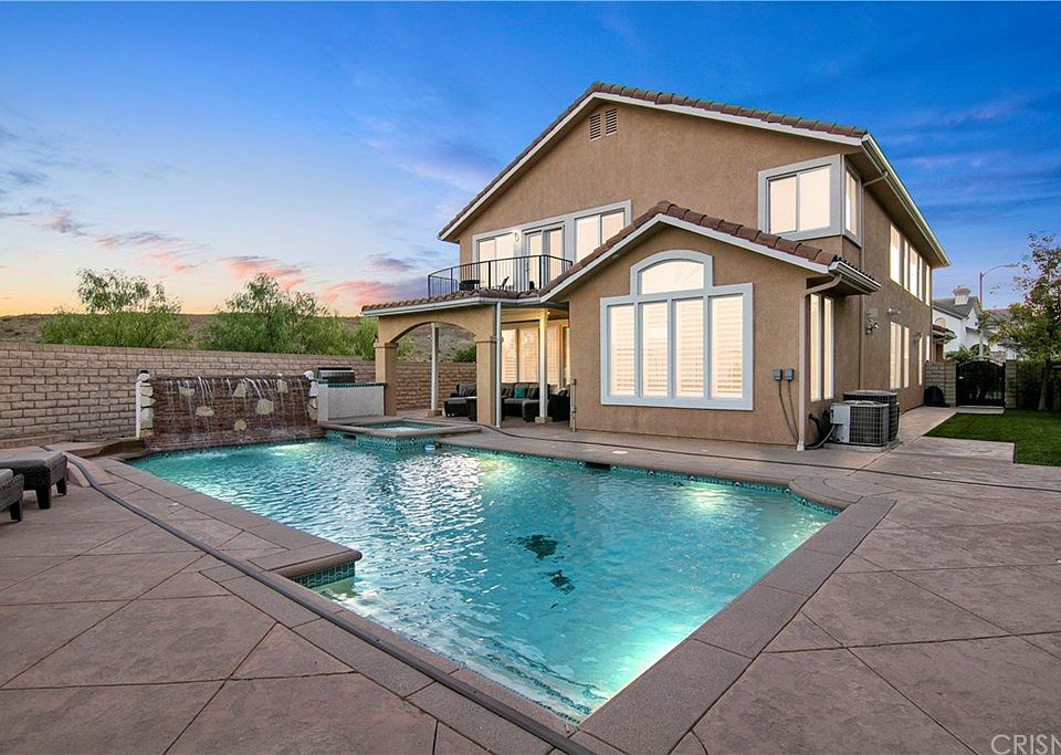 Fabulous home in the Villago at Porter Ranch! The home is situated at the end of a CUL-DE-SAC with an oversized lot. The home is highly upgraded to the max - room between the house next door, no house in front or next to (South) and nobody living behind you. A 3 car attached garage and space to park 8-10 more cars in the driveway. When you enter the house the 2 story living room and dining room greets you with lush wood type flooring, high ceilings, large windows with plantation shutters, and decorator paint tones. At the rear of the home is a large family room with fireplace, open kitchen and large breakfast area. Newer stainless steel appliances including built-in refrigerator and freezer. Center island and loads of high end granite counter tops. Doors open out to the backyard with rectangular pool and waterfall. spa and incredible city view. Upstairs there are 4 more bedrooms and 3 baths and an additional guest bedroom/office downstairs with 3/4 bath across from it and a large laundry room. All baths have been upgraded recently. The master suite has lots of glass and a balcony looking out to the park across the street with panoramic city light views. large master bath with spa tub and walk-in closet. The backyard also has a good sized grass area and built-in stainless steel Viking BBQ. The home has custom lighting outside and all rooms have recessed lighting. More extras - new large water heater, solar panels hidden in the back side ( custom installation ) on the roof.