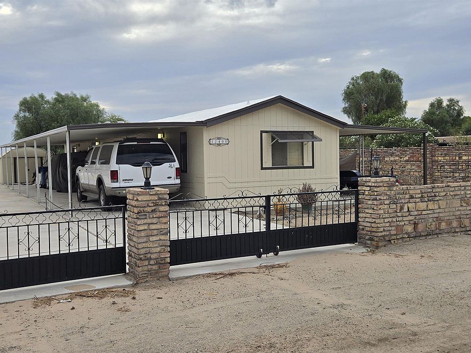 Welcome to this fully enclosed half-acre property is thoughfully didvided into two quarter acre sections. Creating both comfortable living sapce and functional utililty areas. The main residence is a single wide manufactured property home featuring a 3bd, 2ba, complemented by a two vehicle attached carport for everyday parking. Behind the manufactured property has two RV ports with full hookups and clean-outs for convenience. Wide access and ample space to allow for easy manuevering while the layout preserves a sense of openness around the home. The grounds have split APS meters and is secured with perimeter fencing and a gated entrance large enough for RV clearence, ensuring both privacy and practically. With a combination of a well pointed home, RV accommodations, and well organized split lot design, this half acre property offers versatile living for homeowners and guess alike.