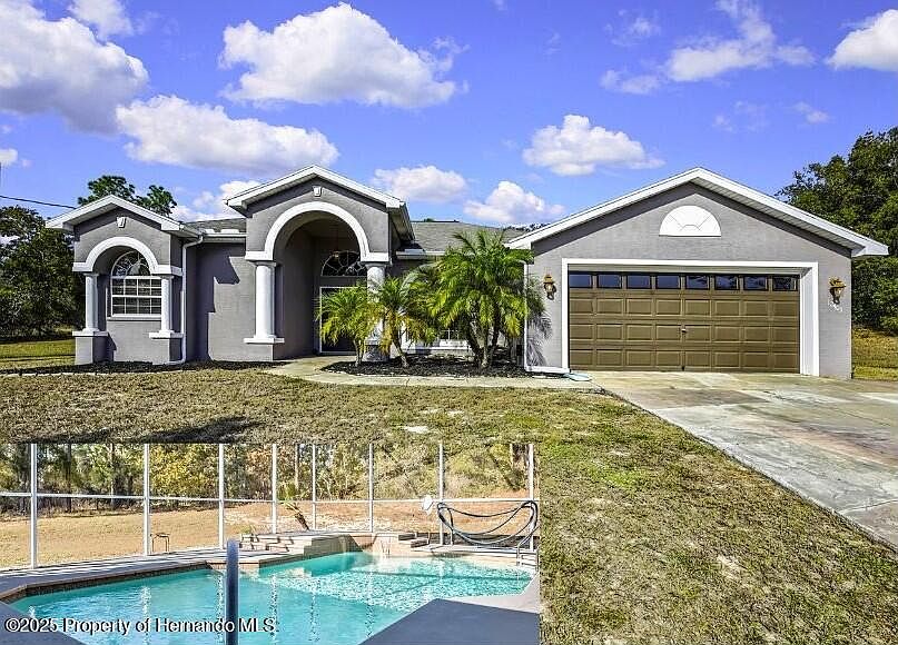Discover a spacious haven perfect for growth and comfort! This impressive 2,473 square foot POOL home features 4 bedrooms and 3 bathrooms, nestled on a generous ONE ACRE of land at the end of a tranquil CUL-DE-SAC, ensuring both privacy and ample space. Ideal for families seeking room to expand or those considering multi-generational living, the home greets you with a well-planned layout that includes a FORMAL LIVING and FORMAL DINING area bathed in natural light from large windows and sliding doors, complemented by soaring 10-FOOT CEILINGS throughout the home The centrally located kitchen boasts plentiful cabinetry, a PANTRY, GRANITE countertops, stainless steel appliances, and a welcoming BREAKFAST BAR, making it an inviting space for gatherings. Adjacent to the kitchen, the BREAKFAST NOOK provides direct access to the pool, while the FAMILY ROOM features built-in shelving and triple sliders leading to the outdoor oasis. The expansive master suite, which also opens to the pool area, includes 2 WALK-IN CLOSETS and a luxurious en suite bathroom with a dual vanity, SOAKING TUB and WALK-IN SHOWER. Bedrooms 2 & 3, along with a shared bathroom, are conveniently located off the kitchen, while bedroom 4 and bathroom 3 complete with a WALK-IN SHOWER and designed as a pool bath, are situated at the rear of the home, offering a private in-law suite option. Additional highlights include an INDOOR LAUNDRY room, a SCREENED-IN POOL with WATERFALL and ELEVATED SUNDECK, and a spacious covered lanai ideal for relaxation or entertaining. The property is set in a NON-HOA neighborhood, surrounded by wooded privacy, and features recent updates such as a new ROOF 2025, a 2024 HVAC system, 2024 WATER HEATER, and a generous two-car garage. NO HOA, NO FLOOD ZONE, NO CDD. Conveniently located near schools, medical, shopping, and the Suncoast Parkway, this home places Tampa just a short drive away.