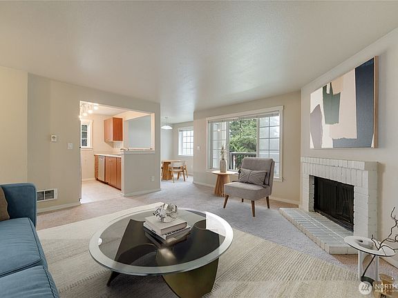 SPACIOUS 3-BEDROOM CONDO IN GATED COMMUNITY—Step into this bright end unit featuring 3 bedrooms and 2 full bathrooms in a thoughtfully designed layout. The dining area opens to a private deck with storage, and the living room features a wood-burning fireplace perfect for cozy evenings. The primary suite offers an ensuite bath and walk-in closet, while two additional bedrooms provide flexibility for guests or a home office. Full-sized washer and dryer included. Enjoy private detached garage plus assigned tandem space and plenty of guest parking. The Bluegrass condo community offers resort-style amenities, including a large pool, cabana, clubhouse with kitchen and fitness center. Conveniently located near transit, shopping. Welcome Home!