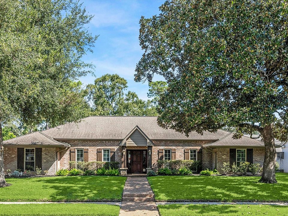 Coveted one-story home in Frostwood! Nestled on a quiet cul-de-sac, this residence boasts high ceilings, slate floors, and a thoughtfully designed floor plan with four bedrooms, three full bathrooms, a powder bath, and a game room. The expanded kitchen features granite counters, a gas range, two ovens, and a built-in refrigerator. Entertain with ease in the wet bar, complete with ice maker, wine refrigerator, sink, and counter seating, opening seamlessly to the family room. The family room is accented with vaulted, beamed ceilings, built-in bookshelves, and a central gas log fireplace framed by French doors that open to the backyard. The large primary suite offers a spa-like bath with a double-head walk-in shower, separate tub, dual vanity areas, and two walk-in closets. Enjoy year-round outdoor living with a sparkling pool, covered patio, built-in grilling area, and bar seating. Zoned to highly sought-after schools, including Bunker Hill Elementary, Memorial Middle, and Memorial High.