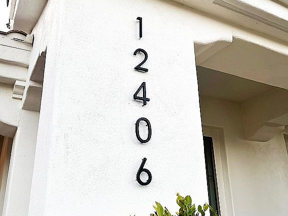 The Private Courtyard is framed by elegant white stone and stucco walls, creating a clean, sophisticated aesthetic. A decorative wrought-iron gate welcomes entry, while the upper level features a charming Juliet balcony with a gracefully curved black metal railing. Dual sets of French doors, one on each level, bring in abundant natural light and enhance the indoor-outdoor connection. Classic architectural details such as the Spanish-style clay roof tiles, exposed beam accents beneath the eaves, and stylish wall-mounted lantern lights complete the warm yet refined Mediterranean-inspired design.