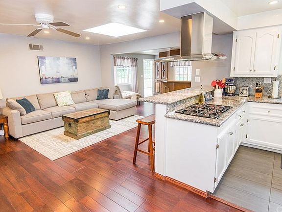 Perched above the street and located in the El Oro Way Charter Elementary and Robert Frost Middle school districts, both rated 9 out of 10 by GreatSchools.org, this stunning single-story home offers chic updates, a flexible floor plan, and a park-like backyard perfectly suited for entertaining and privacy! A double-door entryway welcomes you into the formal living and dining rooms with an inviting fireplace for elegant gatherings. Steps away, you'll find a beautifully updated kitchen with backyard views, granite counters and backsplashes, and stainless steel appliances that opens to the spacious and bright family room with a skylight and impressive wet bar. Secluded sleeping quarters include two amply sized guest bedrooms served by a gorgeously remodeled full bath with dual sinks, and a dreamy master suite with walk-in closet, luxuriously remodeled bath, and sliding glass doors leading out to a patio and the backyard. Smooth ceilings throughout, recessed lighting, and rich engineered wood flooring in most of the rooms add the perfect touch of warmth and class to this incredible home. Meticulously landscaped and with beautiful curb appeal, one of the best features of this home is the expansive, flat backyard with grassy lawn, citrus trees, and mature foliage for ultimate privacy -- perfect for enjoying year-round.