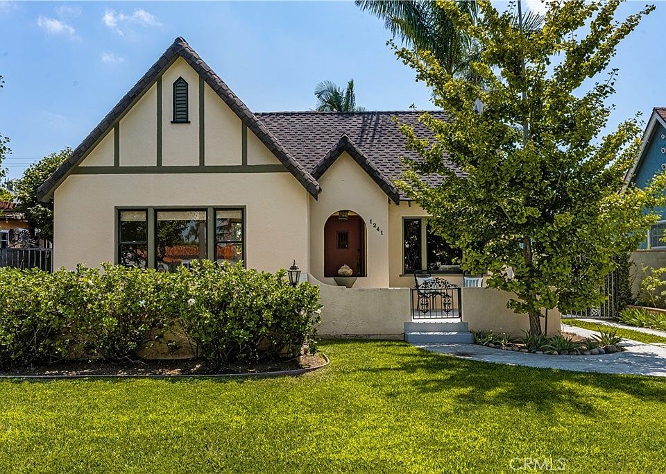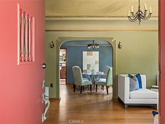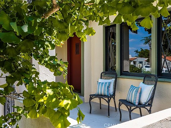 This beautifully preserved 1929 home in Santa Ana’s historic Wilshire Square blends vintage charm with modern amenities. Original hardwood floors, mahogany molding, and wood-framed windows with diamond-pattern glass greet you at every turn. The living room features an arched decorative fireplace, while the formal dining room shines with an antique chandelier. The spacious kitchen boasts soapstone countertops, an O'Keefe & Merritt gas range, and a breakfast nook. Two light-filled front bedrooms share a classic bath with a tub, separate shower, and original built-in storage. The private rear suite, with its own entry, tiled shower, and half bath, offers versatility as a home office or creative space. French doors lead to a lush, landscaped garden with an antique soaking tub. The home also includes a separate laundry room, updated systems like central AC and a tankless water heater, plus plenty of storage. Situated on a quiet, tree-lined street, this home is part of a vibrant community known for its historic charm and neighborhood pride. Don't miss out—call to see this unique gem today!
