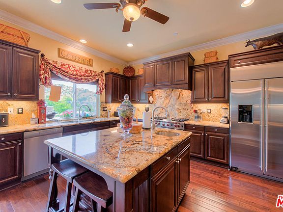 This gorgeous estate is truly turn-key with custom upgrades throughout the approx. 5,664 sqft of open, airy living space with 5 bedrooms and 5.5 bathrooms situated on over an acre with mountain, canyon and peek-a-boo views of downtown LA on a clear day! Dramatic entry with soaring two-story ceilings greet you in the formal living room with custom built-ins surrounding the first of 3 fireplaces. Cook's kitchen features lapidus granite counters, stainless appliances, Wolf range & double oven, center island, walk-in pantry and butler's pantry leading to the formal dining room. Huge master suite features a sitting area, fireplace, 2 walk-in closets, marble appointed bathroom and balcony. The spacious family room with wet bar and fireplace opens to the resort-like backyard with ample patio space for entertaining, built-in BBQ and outdoor food prep area with sink. Soak up some rays from the Baja shelf in the Pebble Tec saltwater pool with separate spa & 2 waterfalls.