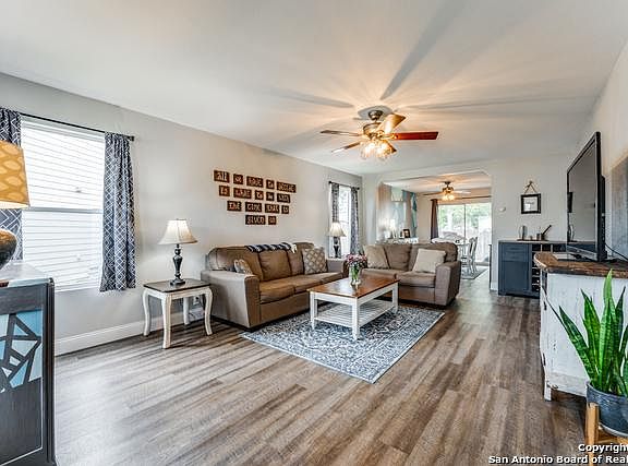 This gem of a home exemplifies an open floor plan with a contemporary vibe! Luxury Vinyl Plank flooring (installed in 2020.) No carpet! Chic contemporary ceiling fans and Edison bulb chandelier are just some of the stylish touches you will find throughout the home. Recently updated Chef's dream kitchen! Upscale quartz counter tops (installed in 2020), subway tile backsplash and trendy floating shelves. Dishwasher 5 years young, smooth cook top range and built-in microwave oven. Stainless steel sink and loads of storage! Spacious owners retreat with tray ceiling, sleek modern ceiling fan, vinyl flooring & walk-in closet. Owners bath with double vanity, separate shower and tub with an eye pleasing accent wall. Enjoy outdoor living and weekend BBQ's in your serene backyard with covered patio and mature shade trees. Home is nestled in a quiet cul-de-sac close to shopping, restaurants, schools, parks and just minutes to Lackland AFB. Whether you are a 1st time home buyer, upgrading, downsizing or an investor looking for your next home, this charming home has it all!