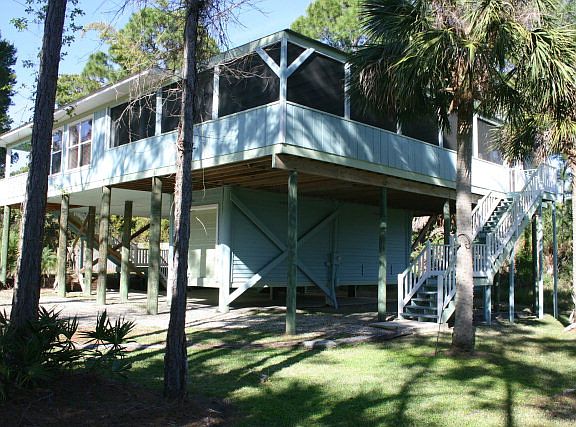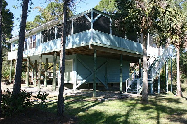 Escape to your own piece of paradise in Tree Tops! FEMA-elevated home w/gorgeous Gulf & salt marsh view & wildlife all around. Relax on the 700+ sq ft screened porch outside your master suite's French doors, where you'll enjoy time in your porch swing, share breakfast at a full-sized table, or nap in your hammock. Under house storage unit w/garage door. The great room cathedral ceiling is accented by generous, well-placed track lighting, creating a serene atmosphere in this beautiful open floor plan home. Adjoining marsh front lot included!