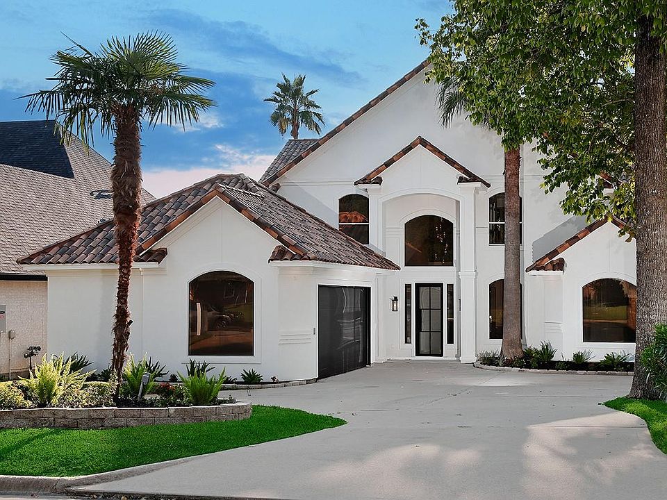 Stunningly remodeled home in 24 hour gated Point Aquarius! This waterfront beauty features new luxury vinyl plank wood-look flooring throughout, remodeled bathrooms, new designer lighting, Nest thermostats, huge laundry room, a gorgeous wet bar for entertaining, and a glass staircase providing unobstructed lake views through the enormous windows. The living area with 30' ceilings and modern fireplace offers doors to the patio and pool. The open and airy kitchen has a quartz waterfall island, Thermador appliances, refaced cabinetry and incredible storage - you can prep food and serve with a side of lake views! Primary retreat offers two spacious his & her closets and a 2nd bedroom suite down; three bedrooms and game room/media room up. The backyard has a covered patio, pool and spa, covered boat dock for two boats, new boat lift motors, and a covered deck above for entertaining guests.