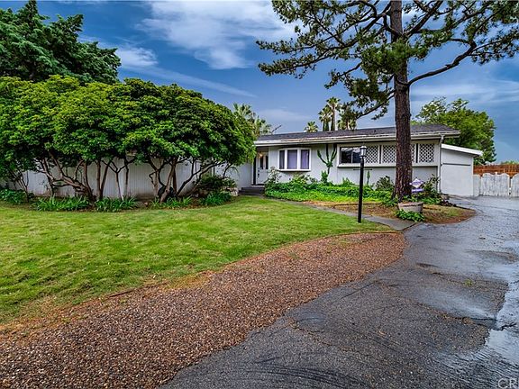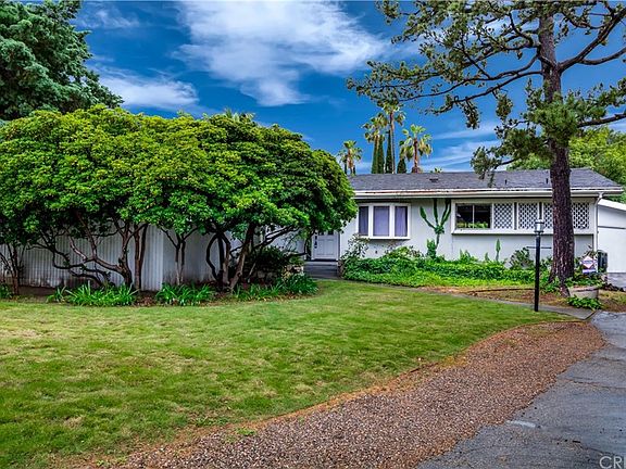 Charming mid-century, ranch-style 4 bed, 3 bath, 2,432 sq ft home, set back from the street on a sizable 19,040 sq ft lot, located in the desirable Knollwood Estates neighborhood. Walk through the covered porch into the formal, tiled entryway and the spacious open-plan living spaces. Separated by an oversized archway, both versatile rooms feature wall-to-wall carpeting, sliding glass door access out to the back patio, and corner fireplaces, the former boasting an enormous, natural stone hearth, the latter a charming iron stove set in a brick hearth. Eat-in kitchen offers black and white décor with built in appliances, pass-through/breakfast bar, and service porch with back door access to yard. Sizable master suite boasts sliding glass door to private patio, walk-in closet, and ¾ en-suite with walk-in shower and separate vanity area. Three further bedrooms are good sized with plenty of natural light, ample closet space, and share a full, hall bath. One bedroom offers sliding glass door access to private gated yard with storage shed. Back yard provides outdoor space for relaxation and recreation with green lawn, landscaping, and pool. Two-car garage without direct access and long drive offer plenty of parking, even for an RV or boat.