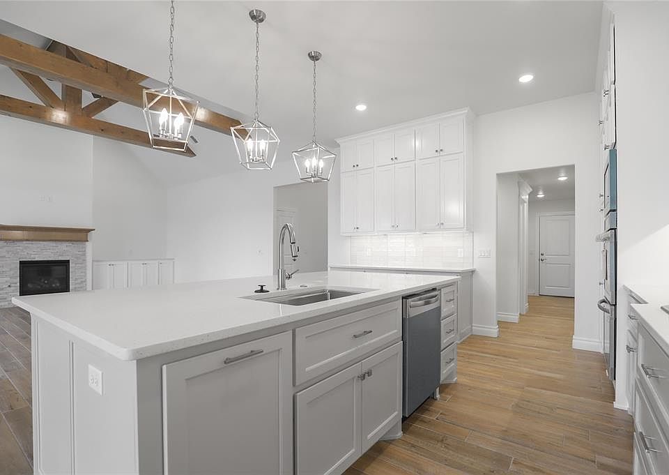 This Wesley Bonus Room floor plan includes 3,630 Sqft of total living space, which features 3,285 Sqft of indoor living space and 345 Sqft of outdoor living space. There is also a 590 Sqft, three car garage with carriage doors and an in-ground storm shelter installed. This desirable home offers 5 bedrooms, 3 full bathrooms, 2 covered patios, a large bonus room, a powder room, and a utility room. The great room supports an immaculate cathedral ceiling with a crows feet detail, a luxurious 3-panel sliding door with a 4' back patio extension, a ceiling fan, wood-look tile, rocker switches throughout, Cat6 wiring, and a gas fireplace surrounded by our exquisite stacked stone detail flanked by built-in lower cabinets on both sides. The upscale kitchen boasts stunning pendant lighting, stainless steel appliances, including a 5-burner cooktop and double ovens, 3 CM countertops, vogue tile backsplash, well-crafted cabinets to the ceiling with cabinet hardware installed throughout and under cabinet lighting, a separate walk-in pantry, and a large center island that holds our new work station sink, a dishwasher, and a trash can pullout. The primary suite provides a sloped ceiling detail with a ceiling fan, a plush carpet finish, and windows. Attached is the main bath which has a batwinged vanity with framed mirrors, a large European walk-in shower, a private water closet, a free-standing tub, and a HUGE walk-in closet! The covered outdoor living area welcomes a wood-burning fireplace, a gas line for your grill, and a handy TV hookup. Other included features for this elegant home include our healthy home technology, an air filtration system, a tankless water heater, double glazed vinyl low E windows with argon, R-44 and R-15 insulation, a fresh air ventilation system, and so much more!