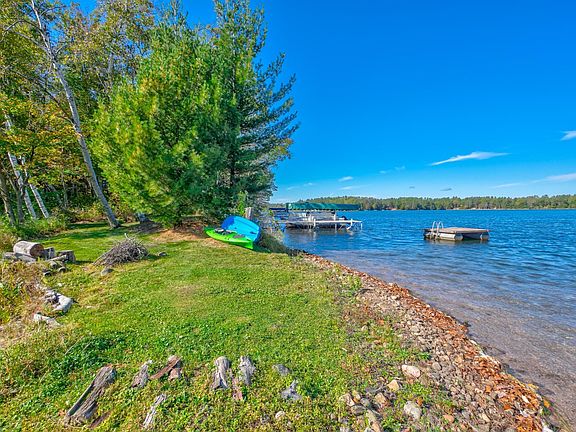 Little Round Lake – Peninsula Setting with Buildable Lot! Tucked among mature trees on 1.91 acres with approximately 775 feet of total frontage on this crystal-clear lake, this distinctive property was thoughtfully designed to take advantage of its point-lot setting. The home offers panoramic views of 179-acre Little Round Lake and has convenient nearby access to 3,294-acre Round Lake. The property showcases a quiet sandy peninsula and a wildlife-filled bay—offering a blend of privacy, natural beauty, and easy access to Hayward’s dining, shopping, and recreation. The 3BR/3.5BA lake home radiates warmth and character, highlighted by vaulted wood-beam ceilings, a dramatic stone fireplace, and walls of windows framing sparkling lake views. The renovated kitchen features custom cabinetry, granite countertops, and new appliances—including a handcrafted Bluestar gas range and ventilation hood. You’ll love the cozy banquette area or den area adjoining the kitchen leading to a screened porch. The expansive great room showcases fine craftsmanship and a welcoming lodge-style ambiance with a wood-burning FP, lakeside dining area, and generous space for entertaining. The master bath remodel is underway to include a large tiled shower, 2 sink vanity with quartz countertops, and wall of storage cabinets (see attached info). Remodeled laundry/storage rooms. Stay comfortable year round with in-floor heat, central A/C. Outdoor living features extensive lakeside decks and a screened porch. Follow the stone path to the shoreline where 240 feet of sandy frontage on the shore and peninsula invites swimming and lakeside relaxation. Or walk along the natural path on the bay side for a different view. Adjacent 0.72-acre buildable lot provides flexibility for additional garage or a home with frontage on the bay. Detached 3 car garage and a playhouse. New shingles on home and garage in 2023. This home is rich in character, move-in ready, and beautifully updated for years of enjoyment ahead.