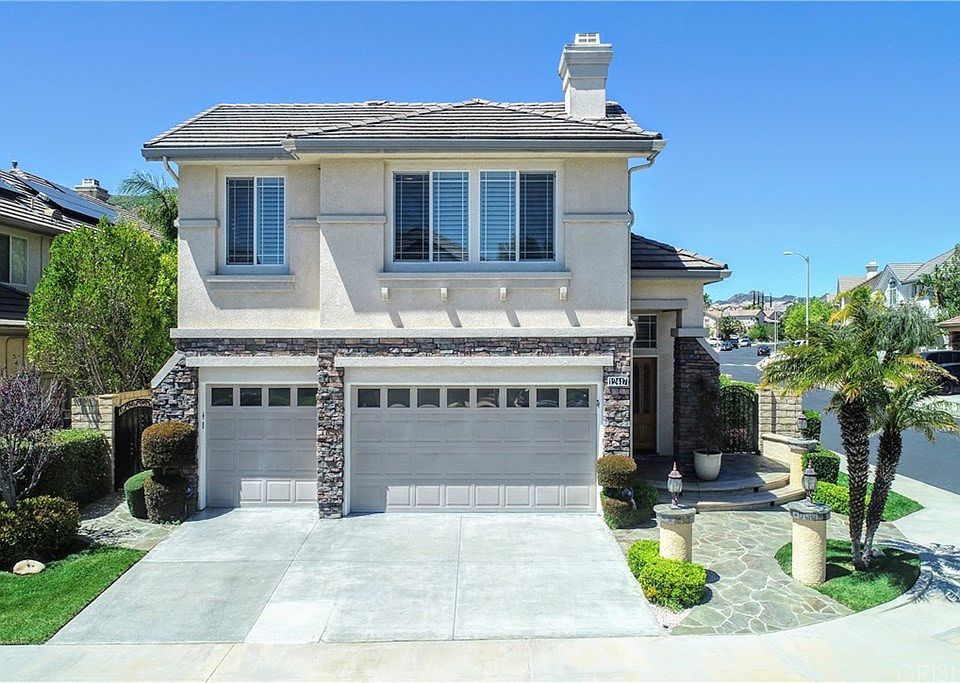You have found it, Look No More. This clean, pride of ownership 4 bed 3 full bath beautiful home in the gated community of Villago in Porter Ranch. This large, corner lot property opens up to cul de sac location with curb appeal, attractive hardscape around perimeter of the property. Three car garage offers plenty of parking in the driveway. This two story home has dual entry doors to appreciate the open living room, dining room, high ceilings, large windows with plantation shutters throughout with one bedroom and full bath, inside laundry room downstairs. With the family room with fireplace adjacent to large open kitchen, walk in pantry, loads of counter space, stainless steel appliances including built in refrigerator and freezer, center island with granite counter tops with direct access to the back yard, built in BBQ with sitting area. Upstairs, there are 3 bed 2 full bath along with oversized bonus room with an additional fireplace and wet bar. This can be used as a movie room, office, home gym or additional conversion to fit your needs. The master suite, master bath with jetted tub, walk in closets along with a private balcony to enjoy morning coffee. With 3,405 sq.ft. of living space, large corner lot on 6,482 sq. ft. located in the highly desirable school boundaries, restaurants, new shopping center, theater, banks, and 118 fwy., beautiful park within walking distance, you will love the lifestyle this home offers in this gated community.