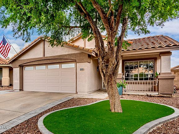 Welcome to this beautifully maintained home in Cactus Park! The curb appeal includes lush turf and travertine pavers leading to a front patio. The open floor plan seamlessly combines the family room, dining area, and living room, highlighted by vaulted ceilings. The kitchen is a true centerpiece with island, SS appliances, and ample cabinetry for storage. The primary suite offers a retreat of its own, featuring dual vanities, a separate tub and shower, a walk-in closet, and private access to the incredible backyard. Out back, the oversized lot is designed for entertaining. A covered patio with travertine stone flows into an extended patio, perfect for BBQs and gatherings with friends. The pool is the perfect size for swimming laps or playing volleyball. You won't want to miss this!