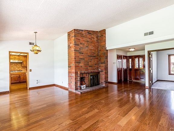 IMMACULATELY MAINTAINED SINGLE STORY IN A HIGHLY DESIRABLE SAN DIMAS NEIGHBORHOOD. Beautiful front curb appeal offers a sweeping concrete walkway w/brick steps, a green lawn, a planter w/mature tree & brick accenting on the front of the home. A covered front entry opens to an open floor plan w/newer real hardwood flooring which run throughout the main living areas & hallway. Living room offers vaulted ceilings, a see-through floor-to-ceiling brick fireplace & a picture window w/beveled glass. Dining room is just off the living room & offers a chandelier, vaulted ceiling, beveled glass slider to the backyard & kitchen access. Family room open to the kitchen w/vaulted ceilings, a ceiling fan, floor-to-ceiling fireplace & a slider to the backyard. Kitchen features classic oak cabinetry w/tile countertops & backsplash, countertop eating area, stainless steel appliances including a trash compactor & a picture window overlooking backyard. Master bedroom w/carpeted floors, a wall of closets, vaulted ceilings & an ensuite bathroom. Master bathroom offers tiled floors, dual sinks & a shower/tub. There are two additional bedrooms, both w/stained glass windows & one with double door entry & open to living room. Full hall bathroom w/stained glass window. Backyard features manicured landscaping, multiple fruit trees including sweet oranges, a concrete deck area w/sprawling covered patio, spacious side yard & block walls on all sides. A new garage door & garage door opener to be installed.