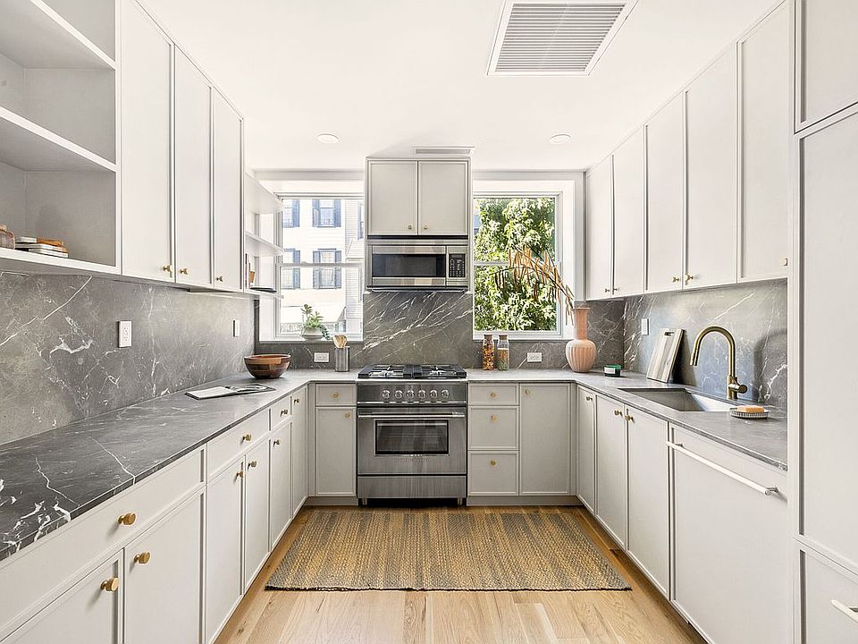 The kitchen is truly the pinnacle of this residence – showcasing lustrous off-white cabinetry paired with sleek yet sultry dark marble countertops providing an abundance of counter space and storage. Polished yet understated, the gold hardware adds a timeless touch to the cabinets, seamlessly complementing the kitchen fixtures. This chef’s kitchen comes equipped with all top-of-the-line Fisher Paykel appliances including a gas range, vented microwave, and a paneled, French door refrigerator and dishwasher.