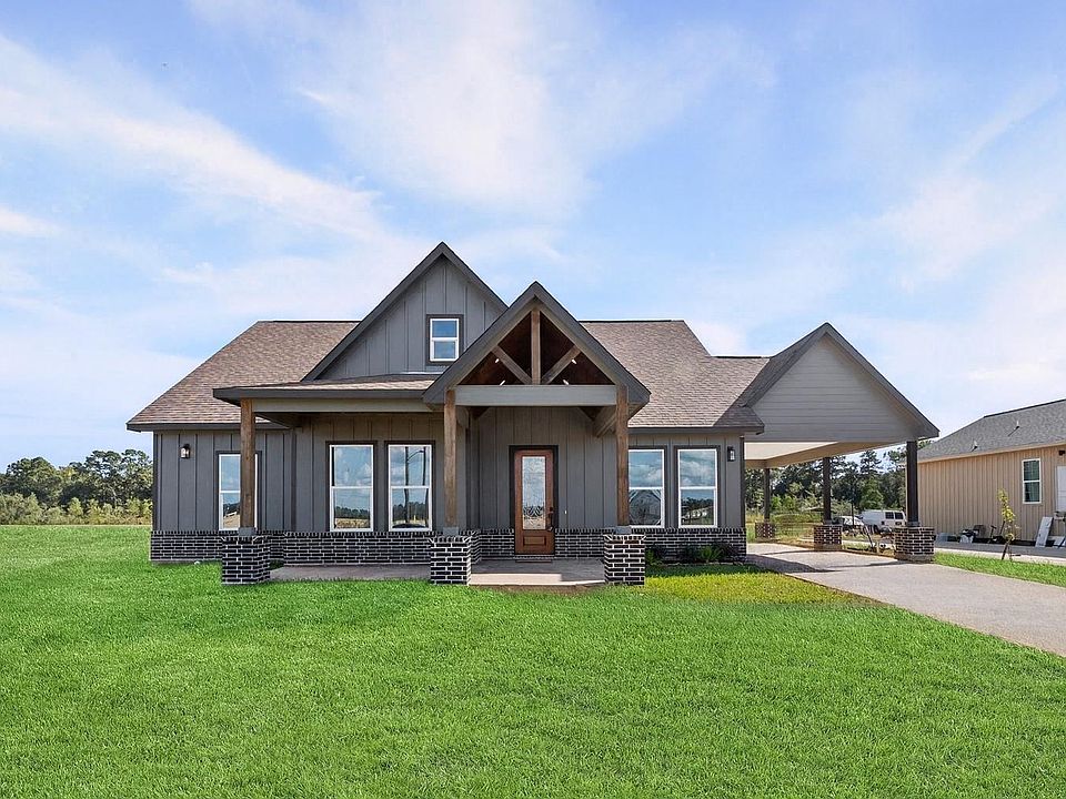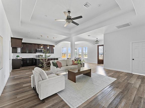 Charming single-story modern farmhouse on a large lot with no back or left-side neighbors for extra privacy. This 4-bed, 2.5-bath beauty features high ceilings throughout and an open layout with a spacious living room and formal dining. The chef’s kitchen showcases 60" custom cabinets, granite countertops, and stainless steel appliances. Relax in the generous primary suite with a walk-in closet and a luxurious en-suite bath. There’s no carpet—laminate flooring throughout for easy maintenance. No HOA and no restrictions mean more freedom for how you use your property. Driveway is currently under construction, but you’ll still be able to drive your work truck to the back of the property for convenient access.