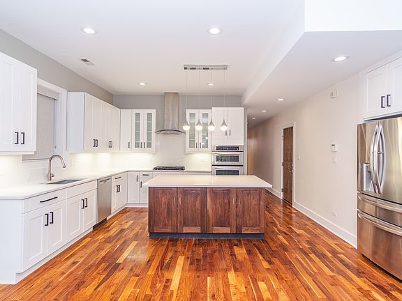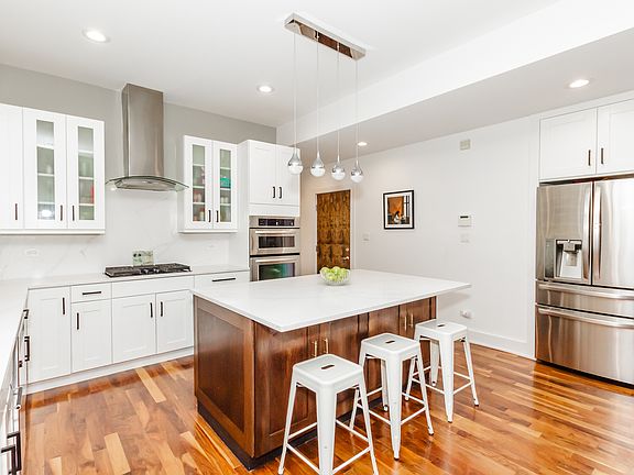 Spacious, modern duplex with four large bedrooms, three full baths, and 2500 sq. ft. of comfortable finished living space, this unit lives like a single family home! White kitchen, quartz countertops and backsplash, huge island, fantastic refrigerator, new Bosch DW. Hardwood floors run throughout the main level, a private front balcony overlooks Jackson St., first floor primary suite, and an additional bedroom- most recently used as an office. The living room is bright and spacious w/ a gas fireplace and dining table space lies between the LR and kitchen. The primary suite seamlessly opens with a private seating area adjacent to the en-suite bath with dual vanities and separate tub & shower. An inviting lower level featuring a high ceilings in the family room, in-unit laundry closet (new front loading washer and dryer), and two additional bedrooms. 1 attached garage parking space included in price. Walking distance to Skinner Park, Whitney Young school, restaurants and shops, and in close proximity to various forms of public transportation make this condo a great find. New furnace, DW, and washer & dryer as well as some new window treatments.