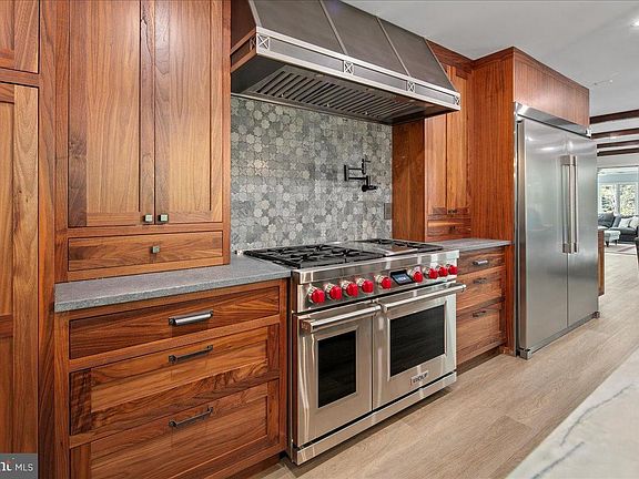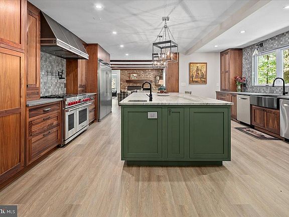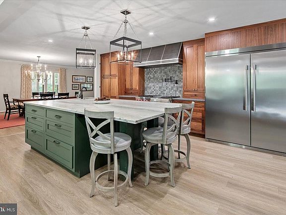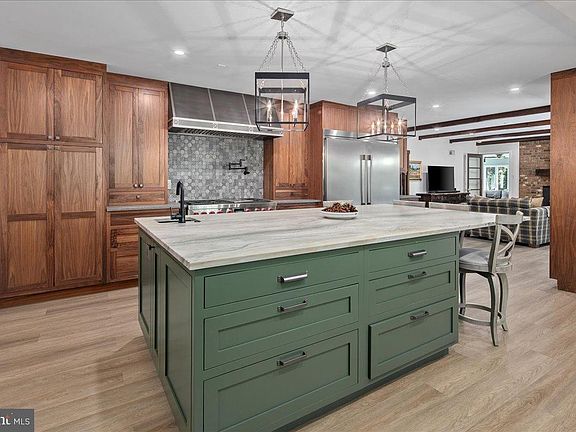 Welcome to this beautifully updated home that seamlessly blends modern design with timeless charm. Featuring a stunning open-concept kitchen, cozy living areas, and abundant natural light, this home offers both comfort and sophistication in every detail. Step into the heart of the home — an incredible gourmet kitchen designed to impress visually and functionally. Updated and expanded in 2023, the kitchen features a stunning Maldives leathered quartzite island (with no seams) with a built-in prep sink and bar seating that anchors the space. It is complemented by rich walnut cabinetry with integrated interior electrical outlets, and sleek Rugged Concrete Caesarstone quartz counters. Top-of-the-line appliances include a Wolf 6-burner gas stove with a custom hood, two dishwashers, and a cabinet-depth refrigerator and freezer. An eye-catching tile backsplash and oversized windows flood the space with light. Adjacent to the kitchen is a spacious family room with exposed wood ceiling beams and a classic brick fireplace, a perfect blend of rustic charm and modern amenities. Glass doors open to a beautiful outdoor patio, enhancing the indoor-outdoor connection. A glorious sunroom offers a relaxed retreat with wraparound windows, ideal for reading, relaxing, or hosting guests. This room is bathed in natural light and offers serene views of the surrounding pastures. The formal dining and living rooms are perfect for hosting gatherings, featuring white oak floors, plantation shutters, & custom draperies. The main level features a bedroom, currently used as an office, that includes a built-in desk. A full bathroom is also conveniently located on this level. Upstairs, the primary bedroom is a serene retreat with a walk-in closet & a beautifully updated en-suite primary bathroom with sleek double vanity, and a large, glass-enclosed walk-in shower with subway tiles. A second washer and dryer are a bonus in the primary suite. The upper level includes four bedrooms, all with hardwood floors, and two full bathrooms, both with double vanities. The finished lower level is an entertainer's dream, offering a versatile space for games and relaxation. A wet bar provides a perfect spot for serving drinks, and a large storage room with utilities offers abundant storage. Step outside to the fantastic outdoor living space, perfect for entertaining and enjoying the serene surroundings. The large patio features an outdoor kitchen, a hot tub, and two tranquil ponds. The property features a 5-stall center aisle horse barn, each with front and back doors leading to its own paddock and a wash stall. There's a separate hay barn, a grass schooling area, and multiple fenced turn-out pastures with elegant 3-board wood fencing. Direct access to incredible ride-out trails makes this a true equestrian's paradise. Beyond the barn, the expansive grounds include a sensational 100 x 50 vegetable garden, a chicken coop, and a tractor shed. A new roof was installed in 2018 and a new hot water heater in 2017. The grand circular driveway was upgraded in 2023 and provides an impressive entrance with an additional parking alcove, leading to a 2-car garage. This home is a perfect showcase of classic character and modern design.