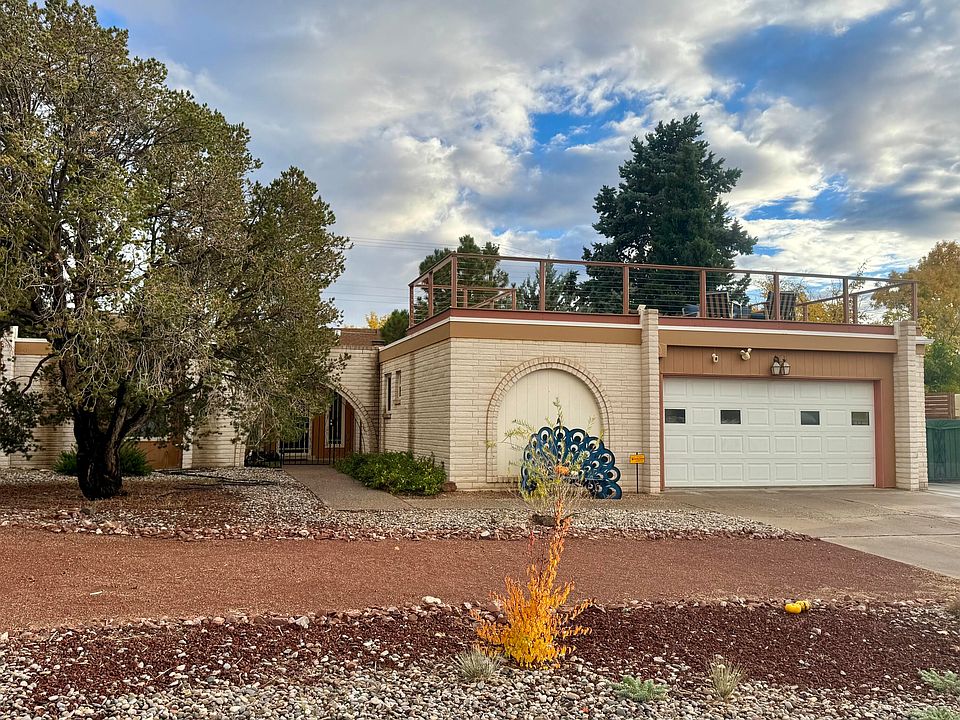 The views! Gaze from Mt. Taylor to the Sandias. Spacious deck over the garage expands the outdoor living space to the roof. New roof in 2022, warranty conveys.This beautiful open, bright brick home features oversized garage, and large front entry with security gate/courtyard.The kitchen is a cook's paradise, renovated in 2025 with stainless steel fridge, five burner gas cooktop with griddle and air fryer convection oven. Microwave convection combo with new cabinetry and plenty of counter space. Kitchen opens to a large livingroom with a wood burning fireplace surrounded by built in book shelves.Large yard with mature trees. Two driveways and vehicle access to the backyard, so you can easily store your toys. Flex room with space for your home gym, office or zen oasis.MUST SEE!