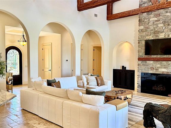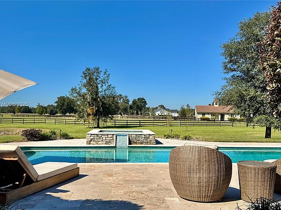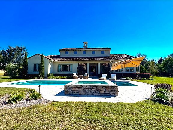 Luxury Tuscan estate in the gated equestrian community of Bel Lago, just minutes from the World Equestrian Center. This 4BR/4BA + media room home boasts over 3,800 sq ft under air with cathedral ceilings, travertine finishes, plaster walls, custom kitchen, formal dining, and a gas fireplace. Enjoy sunset views over the pool and pastures. The spacious primary suite, ample closets, tray ceilings, and elegant details throughout offer both beauty and comfort. A breezeway leads to a 2-car garage with AC and an upstairs room. Outdoors, a 41x14 heated pool/spa (2020), 3-stall concrete block barn (2022) with tack room, bath, 2 paddocks, and 200x100 arena make this ideal for equestrian living. Direct access to trails and set on over 5 acres with professional landscaping and cryo board fencing.