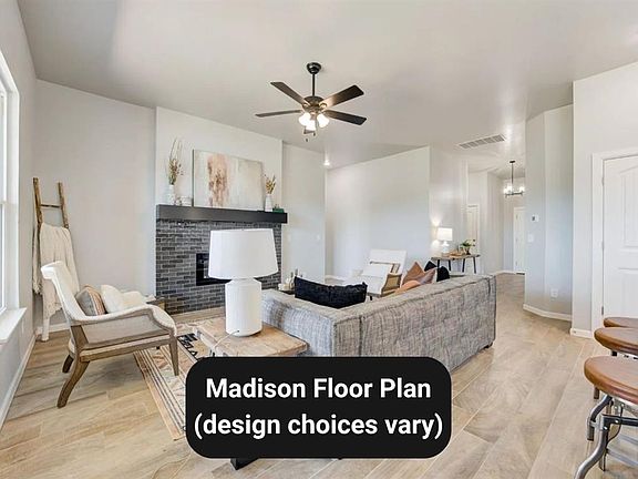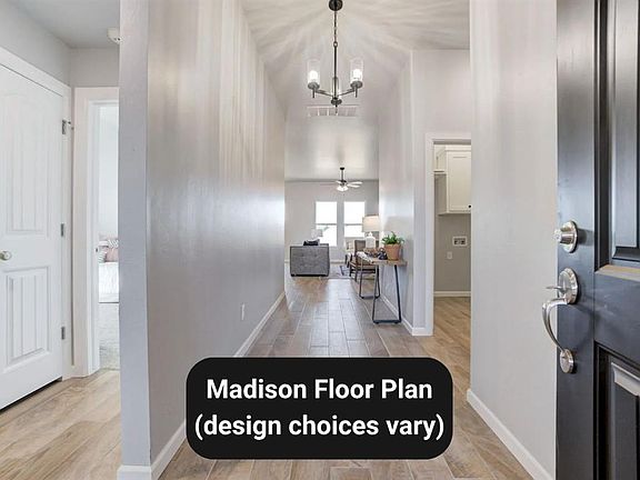 Ask about our incentives! The Madison blends spacious comfort with smart, intentional design, offering an open living area with vaulted ceilings that flows seamlessly into a well-appointed kitchen and dining space ideal for both daily life and entertaining. The kitchen features a center island, walk-in pantry, and direct access to the backyard for easy indoor-outdoor living. The private primary suite creates a true retreat with dual vanities, a walk-in shower, and a generous closet connected directly to the utility room for added convenience. Two additional bedrooms share a well-designed hall bath, and the covered front porch with Craftsman-style details adds timeless curb appeal to the home’s exterior.