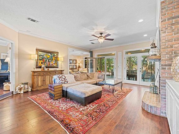 Welcome to this beautiful brick home in highly sought-after Gulf Breeze Proper, offering strong curb appeal with its prominent roof pitch, classic brick siding, and inviting architectural lines. Step inside to an impressive great room highlighted by high ceilings, a cozy wood-burning fireplace, built-in bookshelves, and French doors that open to a lovely sunroom—creating the perfect blend of warmth and elegance. This thoughtfully designed split floor plan features a spacious primary suite, a guest suite with private access, and two additional bedrooms that share a full bath—ideal for family and guests alike. Multiple living areas and 9-foot ceilings throughout enhance the home’s open, comfortable feel. The sunroom with charming brick flooring overlooks a beautiful backyard entertaining area with a fire pit, perfect for gatherings or quiet evenings outdoors. Interior highlights include plantation shutters on select windows and engineered wood-look flooring that flows through most of the home, offering both style and easy maintenance. The centrally located kitchen boasts abundant cabinetry, stainless-steel front appliances that include a wall-mounted oven and microwave with convection option, and versatile dining spaces including a breakfast bar, breakfast nook, and formal dining room. Located within walking distance of Gulf Breeze’s top-rated schools and nearby parks with water access, this home also offers quick access to world-class beaches, Historic Downtown Pensacola, premier shopping, dining, and Pensacola International Airport—making it one of the most desirable addresses on the Gulf Coast. Additional features include a two-car garage with floored storage space above, providing ample room for organization and convenience. Classic curb appeal, timeless design, and an unbeatable location—this Gulf Breeze Proper home offers the ideal blend of comfort, style, and coastal convenience.