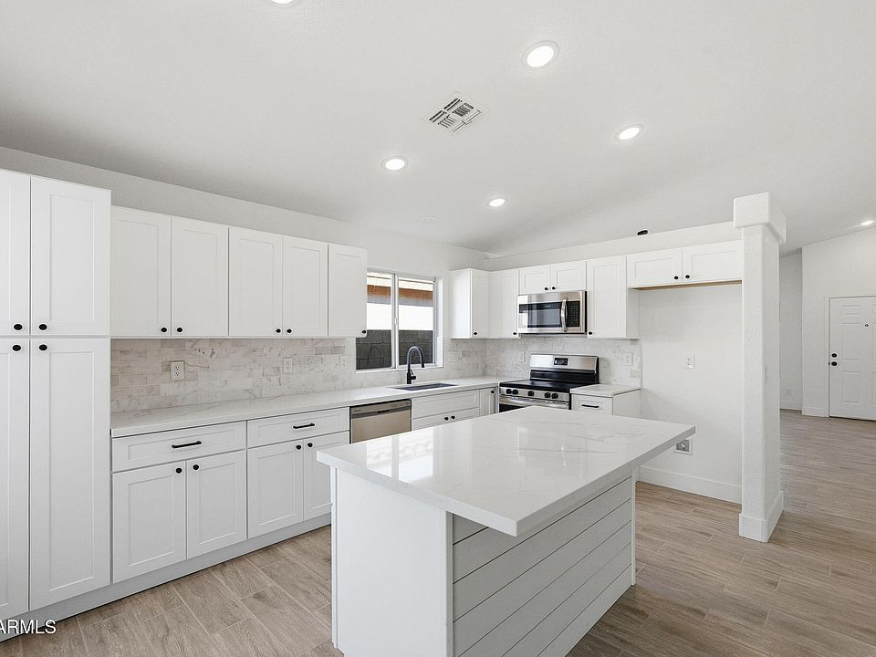 Step inside this stunning 3 bed, 2 bath home featuring fresh paint, inside & out. With new wood-look tile flooring that flows seamlessly through the main living areas. The great room connects effortlessly to the updated kitchen. The kitchen showcases custom shaker cabinetry, a tiled backsplash, sleek quartz countertops, stainless steel appliances & a convenient breakfast bar. You'll find new carpeting throughout all the bedrooms. The primary suite is complete w/ a walk-in closet & a updated en suite bath featuring a new dual-sink vanity, a walk-in shower & a separate soaking tub. Enjoy your own low maintenance back yard w/ a covered patio & fresh green grass growing. Additional upgrades include a NEW Roof & NEW Water Heater!
