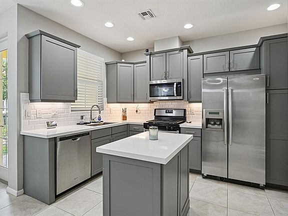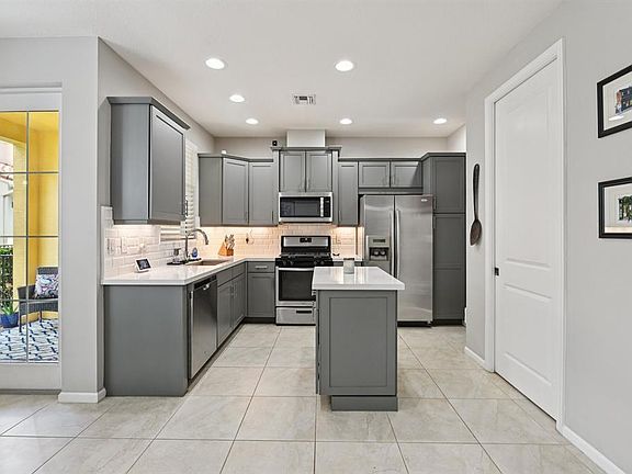 Beautifully updated 3BR/2.5BA townhome with split 2-car garage in the resort-style community of Artesia. The main level features tile flooring, a stylish dry bar, and a fully renovated kitchen with quartz countertops, subway tile backsplash, grey shaker cabinets, gas range, and stainless steel appliances, opening to a spacious dining and living area plus half bath. Upstairs, the primary suite offers vaulted tray ceilings, a walk-in closet and a spa-like bath with dual sinks, a soaking tub and a separate shower. Two additional bedrooms, a full bath, and laundry complete the second floor. Highlights include a 2-year-old A/C, impact windows/doors, a private fenced patio, and ample guest parking. Community amenities: 2 pools, fitness center, indoor basketball, tennis, pickleball and playground