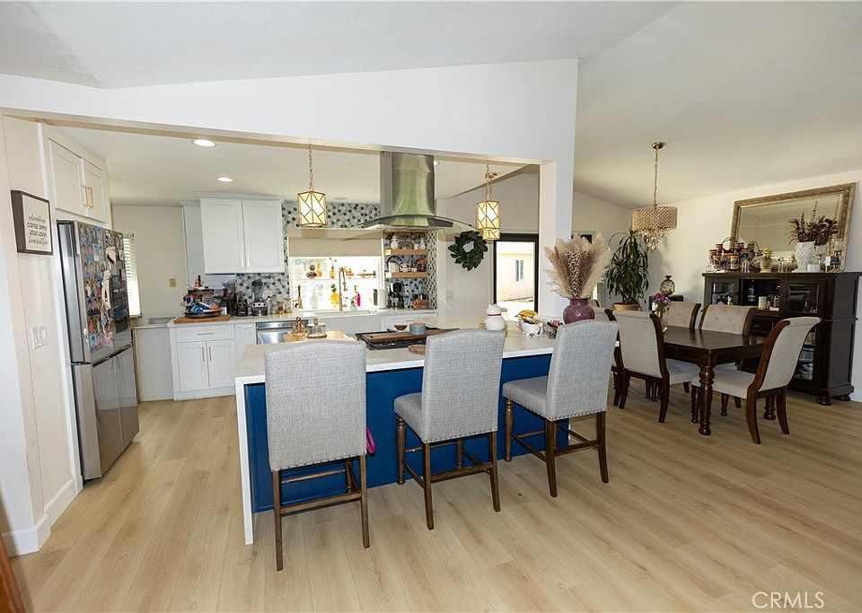 The home has been beautifully upgraded, showcasing a stunning kitchen with white cabinets, waterfall quartz countertops, and a decorative tiled backsplash. Additional features include newer windows, new flooring throughout, a wine fridge, an upgraded primary bathroom, ceiling fans, solar energy, a tankless water heater, and newer A/C. This home is gorgeous!