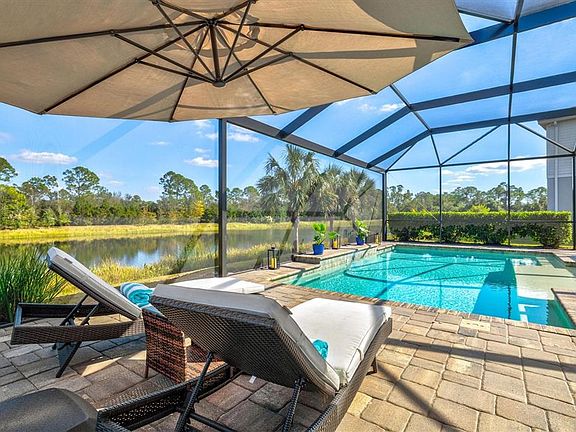 Welcome to 12436 Destin Loop, a FULLY FURNISHED Sanibel model from the Coastal Series, located in Grand Palm’s exclusive private gated area within the community and near the vibrant Wellen Park community. Offered fully furnished, this turn-key home allows you to move right in and enjoy MAINTENANCE FREE Florida living at its finest. Step outside to your private Florida retreat—one of the home’s most impressive features. The sparkling saltwater pool is surrounded by a panoramic screen cage and includes a Paradise Grill and a TV. Everything is included for the buyer, making this space perfect for effortless entertaining and tranquil waterfront relaxation. Mature landscaping and expansive preserve and pond views provide complete privacy. A paver driveway and walkway lead to a charming covered front porch sitting area and a durable tile roof, setting the tone for the quality found throughout the home. Inside, you’ll appreciate 10-foot ceilings, 8-foot door openings, crown molding in the living room tray ceiling, and a custom built-in fireplace and mantel that create a warm and elevated living environment. The gourmet kitchen showcases quartz countertops, a stylish tile backsplash, 42-inch shaker cabinets, a natural gas range with a wood vent hood, a convection oven, GE stainless steel appliances, and a walk-in pantry with custom shelving. The spacious primary suite includes two large walk-in closets, dual vanities, a soaking tub, a walk-in shower, and refined finishes throughout. Custom closets are thoughtfully integrated for exceptional organization. Additional features include an Extended Club Room, roller blackout blinds, ceramic tile flooring, an epoxied three-car garage, and glass shower doors in all three bathrooms, and a WHOLE-HOUSE NATURAL GAS GENERATOR.