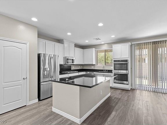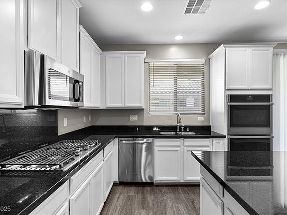 Luxury, comfort, and modern upgrades await in this gated Southern Highlands 6-year-old home! Located in a community with beautiful mountain views, this 4 bed, 3 bath gem offers a flexible open floor plan with multiple bedrooms both upstairs and down. The gourmet kitchen features granite counters, stainless steel appliances, double ovens, & a walk-in pantry. Enjoy designer touches throughout — two-tone paint, LVP floors, recessed dimmable lighting, and brand-new carpet. The downstairs primary suite offers a separate tub & shower, and a large walk-in closet. Upstairs features two bedrooms, one that opens up to a balcony, and a bathroom. Relax in the private low-maintenance backyard with a covered patio, synthetic grass, & desert landscaping. This home features solar panels for low energy bills, a water softener, and all of the appliances convey, including the washer & dryer. Conveniently located near top dining, shopping, Allegiant Stadium, & easy freeway access — this home has it all.