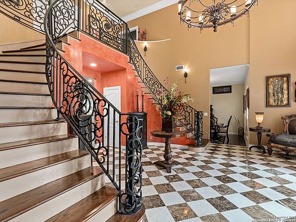 Elegant home tucked away on a quiet cul-de-sac in the prestigious guarded community of Elm Creek, offering the perfect blend of privacy, sophistication, and modern updates. Step into a grand foyer with soaring 24-foot ceilings, a dramatic double staircase, and a striking custom iron front door. The foyer is anchored by a beautiful fleur-de-lis chandelier, setting the tone for timeless elegance. The open floor plan flows effortlessly, showcasing two spacious living areas-one with a cozy wood-burning fireplace-plus a versatile media/game room equipped with a projector and movie-sized screen. The island kitchen features a breakfast bar and gas cooktop (replaced in 2024), ideal for casual dining and entertaining. The luxurious primary suite includes its own fireplace and access to a completely rebuilt balcony (2023) that spans the full width of the home. The spa-like primary bath offers a whirlpool tub for relaxation. All rooms throughout the home are generously sized, with fresh paint in the foyer and bathrooms, and the downstairs bathroom fully renovated. Extensive updates completed in 2024 include: new balcony, HVAC system, water heater, water softener, sprinkler system, ceiling fans, pool pump and heater, exterior paint, and more. Outdoors, enjoy your private oasis with a sparkling pool and spa, charming gazebo, covered deck, and a built-in BBQ pit perfect for entertaining. Mature trees and a stately iron fence provide shade and seclusion for gatherings large or small. This is Elm Creek living at its finest!