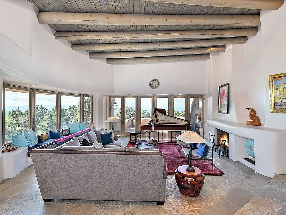 Oversized fireplaceRustic beamsBanco seating areasElegant dining areaNew drivewayNew pine treesSanta fe city lights