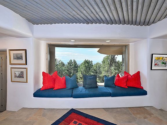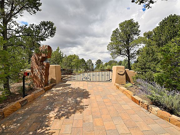 This striking 5-bedroom, 5.5-bath residence, set on 1.19 forested acres in High Summit, offers commanding views of the Jemez Mountains and Santa Fe city lights, creating a mesmerizing backdrop that transforms with the setting sun. Designed with the essence of Santa Fe style, this home includes soaring ceilings framed by rustic beams, a harmonious blend of hardwood and flagstone floors, and unique banco seating areas. Step into the grand living room, where an oversized fireplace makes a bold statement, effortlessly flowing into an elegant dining area that invites gatherings and celebrations. The outside portal calls to those who enjoy alfresco living, featuring an outdoor kiva and a hot tub that promise evenings of relaxation and stargazing. The kitchen, complete with a Wolf range and a Subzero refrigerator, seamlessly connect to a den/media room with its own kiva fireplace. The primary suite features a fireplace, sitting area that opens to the outdoor portal and a gorgeous spa-like bathroom, showcasing a soaking tub, a fireplace for those chilly evenings, and an expansive walk-in shower with double shower heads. In addition, there is a detached 2-bedroom, 2-bath guesthouse. Recent enhancements, including new pine trees and a new driveway, alongside a newer roof with a 10-year warranty. Located just minutes away from the renowned Ten Thousand Waves Spa, the Santa Fe Ski Basin, Dale Ball Trails, and the downtown Plaza
