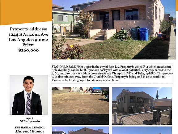 STANDARD SALE Fixer upper in the city of East LA. Property is zoned R-4 which means multiple dwellings can be built. Specious back yard with a lot of potential. Very easy access to the 5, 60, and 710 freeways. Main cross streets are Olympic BLVD and Telegraph RD. This property is also minutes away from the Citadel Outlets. Property is being sold in as is condition. Please contact listing agent for showing instructions. Brokered And Advertised By: Keller Williams Realty Downey Listing Agent: Marrnol Rosales Ramos