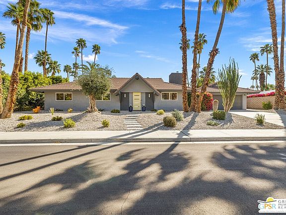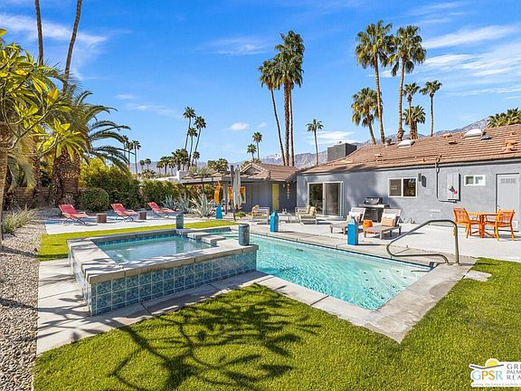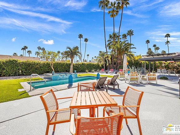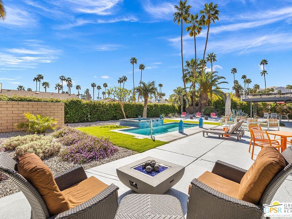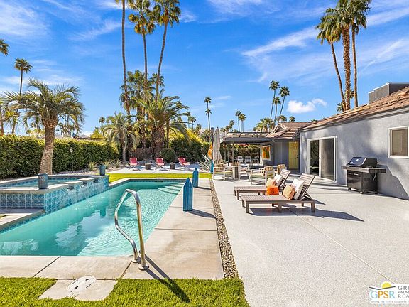 Welcome to this meticulously renovated modern home in one of South Palm Springs' most sought-after neighborhoods, Los Compadres. Situated on land you own, this home features a comprehensive floor-to-ceiling transformation, delivering high-end finishes and remarkable outdoor living spaces with breathtaking mountain views to the East, South, and West. It truly shows like a model! Step inside to discover an airy, open-concept floor plan bathed in natural light. The home boasts sleek modern cabinetry, Cambria quartz countertops, and terrazzo tile flooring throughout. The resort-style backyard is an entertainer's dream, featuring a sparkling pool, a separate in-ground spa, multiple outdoor living and dining areas, lush landscaping, and panoramic, wire-free mountain views. Additional highlights include brand-new dual-pane windows with custom window treatments (installed in 2022), updated electrical wiring and plumbing, as well as new interior and exterior doors. The home also features a newly installed HVAC system and paid-off solar panels for energy efficiency. There's no HOA, and the property qualifies for a Vacation Rental Certificate, making it an excellent opportunity for short-term rentals! The chef-inspired kitchen seamlessly opens to the living and dining areas, both of which offer sweeping views and easy access to the outdoor space. The backyard is beautifully framed by colorful, low-maintenance landscaping, creating a serene environment for relaxation. The primary ensuite retreat offers stunning views, direct access to the private backyard, and a spa-inspired bathroom with modern cabinetry, Cambria quartz countertops, dual sinks, and a large walk-in shower with a clerestory window, frameless glass, and dual showerheads. The two west-facing guest bedrooms are equally impressive, with mountain views, terrazzo tile flooring, and convenient access to the beautifully appointed hallway bathroom, featuring modern cabinetry, Cambria quartz countertops, dual sinks, and a shower/tub combination with dual showerheads. Additional features include an indoor laundry area, making this home as practical as it is stylish.