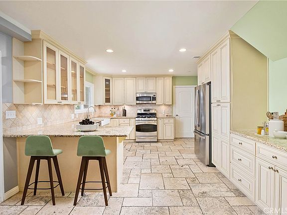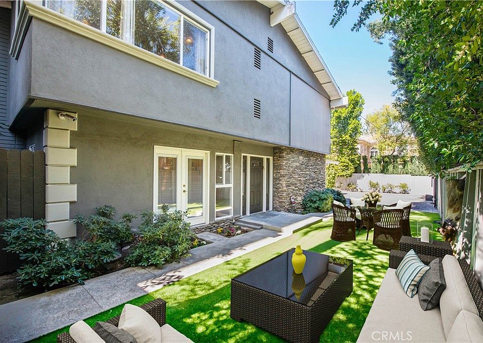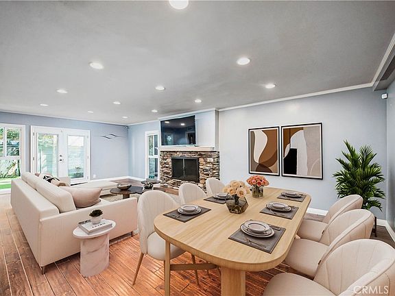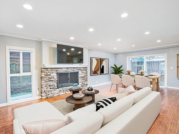 Look no further! Tucked at the end of a spectacular and ultra-quiet cul-de-sac street, sits this beautiful and pristine gated compound. Beautifully updated and highlighted with gleaming wood floors, open living spaces and designer details throughout. Featuring a remodeled chef's kitchen with loads of custom cabinetry, granite counters w/breakfast bar, Versailles pattern travertine floors, farm sink and luxurious stainless appliances. Expansive dining area and wonderful living room with central stacked stone fireplace, crown molding details along with both front and rear patio access and views. Encompassing four spacious bedrooms with downstairs suite and three additional upstairs bedroom that include its sumptuous upstairs primary suite with sitting area, romantic tumbled stone fireplace, dressing area and luxurious spa styled bath with dual sink vanity, seamless glass shower and toasty heated floors! Take advantage of both front and rear yard entertaining areas outfitted with artificial turf, mature landscape and expansive paver driveway. Fully finished garage, tankless water heater, LED lighting, and in-wall data wiring are just a few of the wonderful updates this magnificent residence has to offer!