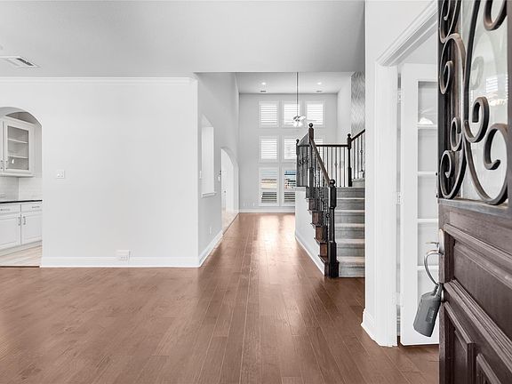 A North-facing striking blend of modern design and timeless warmth. Soaring ceilings, warm wood flooring, and wrought iron staircase railings set a dramatic tone in this beautifully crafted residence. The open-concept layout connects a generously sized kitchen with an inviting living area, complete with an eat-in breakfast nook, spacious island, and a butler’s pantry that leads to a formal dining room framed by deep-set windows—perfect for statement décor or cozy window seating. For added luxury the home has a whole house water softer and custom accent walls in select bedrooms.