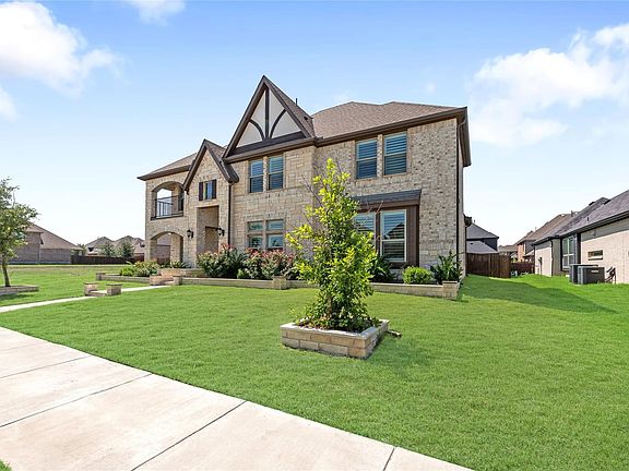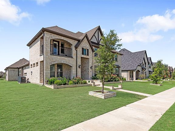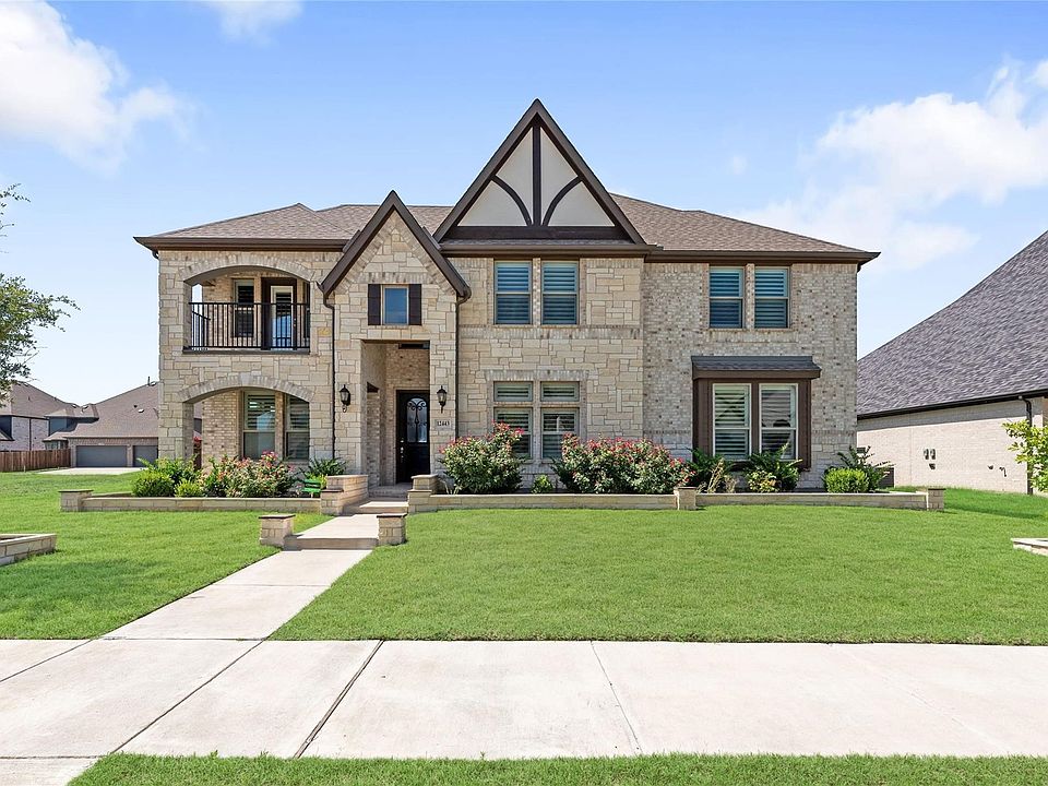 Outside, the home impresses with eye-catching curb appeal—light stone and brick accented by dark details, manicured stone flower beds, a welcoming front patio, and a charming upper balcony that adds both function and flair.