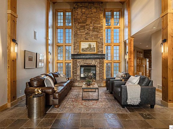 Contract Pending On market for back up offers only. Vacation Every Day at YOUR PRIVATE RESORT! Main House=4 bed, 6 bath. Garages fit 24 cars. Impressive vaulted beamed great room w/ expansive windows, slate floors, custom woodwork & stone fireplace. Chefs kitchen opens to flexible use hearth/dining room & formal dining/office w/ water views. Oversized Primary Suite & Bath being remodeled. Lower Sports Bar w/ gaming areas, 7 TVs & deluxe sound system. Guest House is attached by main floor walkway & has private entrance (perfect for home office). Main Level=Living/Dining, Kitchen & Guest Suite. Upper Level Suite w/ kitchenette, bath & balcony overlooking lake. Lower Level: Bar, Wine Cellar, Exercise room, Pool Baths & Spectacular 2 story indoor saltwater pool/spa room you can enjoy all year long! Guest House 20+ Car Heated Garage: Expansive main level garage RV bay (or sport court), car elevator to lower garage. Outdoor: Double Lot, Heated Driveway, Fire Pits, Water Feature, Lighting
