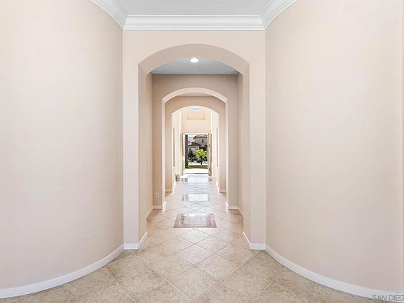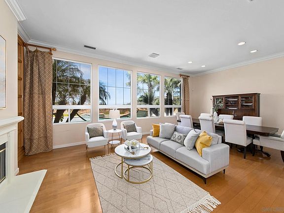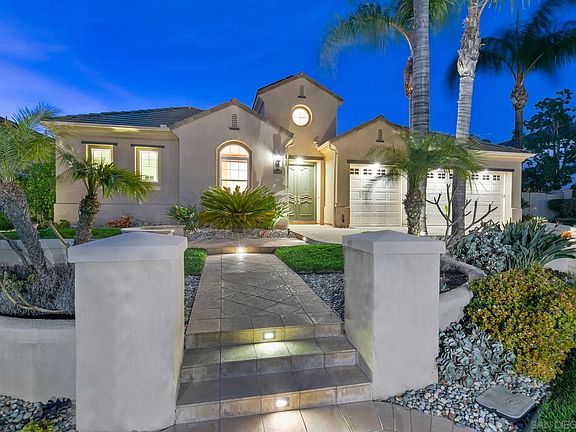 Elegant Single-Story Home in The Arbors, South of Pomerado. This stunning home on a cul-de-sac showcases dramatic architectural design, upscale appointments, & a resort-style yard with panoramic mountain views. The outdoor space features a sparkling pool/spa, BBQ island, firepit, & a low-maintenance landscape. The property also boasts a fully owned 28-panel solar system with a Tesla charger. The grand double-door entrance opens into a spacious hallway with soaring ceilings. Exquisite designer tile flooring with granite-accented inlays creates a striking first impression, leading to the refined living and dining areas, which include a fireplace, crown molding, floor-to-ceiling built-in bookcase, and warm maple wood floors. The expansive family room offers a built-in media center and a fireplace, flowing seamlessly into the gourmet kitchen. This chef’s dream space features a large dining nook, oversized island with breakfast bar, quartz countertops, and top-of-the-line Viking appliances, including a six-burner gas cooktop, double oven, warming drawer, and built-in refrigerator. The sumptuous primary suite is a private retreat, featuring a third fireplace, custom built-ins, breathtaking views, and direct access to the pool. The additional two bedrooms are generously sized, one with an ensuite bathroom. The fourth bedroom is thoughtfully designed as a sophisticated office, complete with a gorgeous floor-to-ceiling custom bookcase. Additional Features: Integrated sound system, Whole-home water filtration system, & Three-car garage.