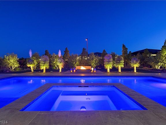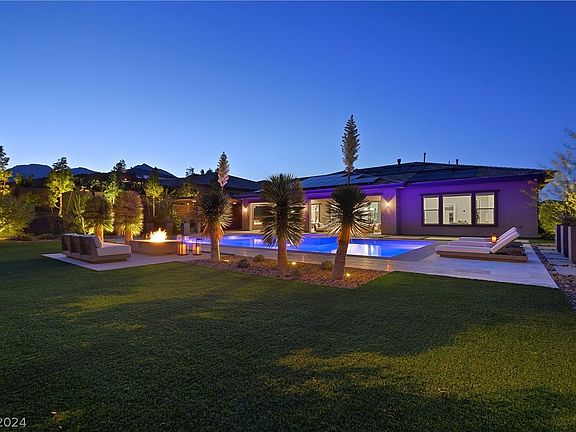 Enjoy luxury, indoor/outdoor living in a single-story home with its own private backyard paradise in Scots Pine, Summerlin. Upon entering you're met with a magnificent view of the pristine, landscaped backyard and 900+ s.f. pool/spa through two multi paneled glass sliders that open on to a covered patio area complete with a custom fireplace/TV and separate BBQ area. The kitchen features custom cabinets, Quartzite countertops, GE Monogram appliances, walk-in pantry and butler's area with two wine refrigerators. The primary bedroom suite has automated shades, huge, zero threshold walk in shower, two built-out walk-in closets, and direct access to the laundry room. The 3-car garage has epoxy flooring and extra storage. Solar systems for both the house and pool/spa are paid off. Other upgrades: Control 4 automation, Halo water filtration, tankless water heater and more. Located in a cul de sac, this house sits on a corner .4-acre lot in a beautiful gated all-single-story home community.