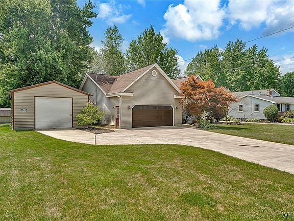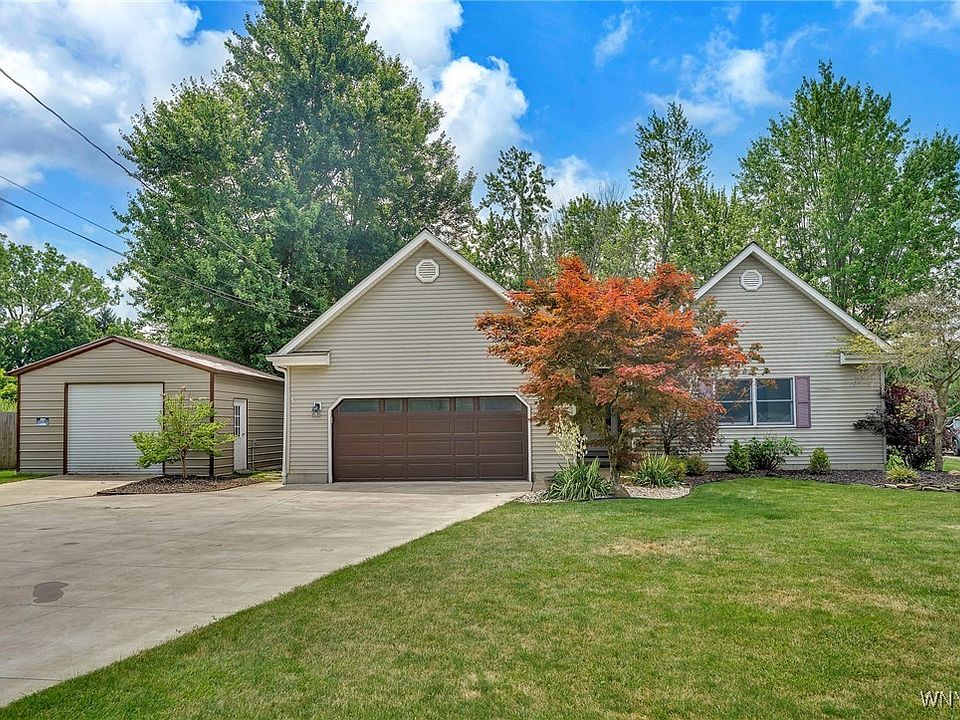Bring Home Happiness in this rare modern ranch offering with soaring ceilings & an abundance of natural light,creating an open,inviting feel throughout.Enjoy handsome curb appeal enhanced by low maintenance landscaping before pulling into the attached 2.5 car garage w/ so much storage capacity & be confident knowing that downsizing doesn't mean giving up everything!Walking into the bright & spacious great room you can breathe a sigh of relief that you've found the one you've been looking for.Soaring ceilings provide a sense of space that is rarely found in single floor plan homes.Lovely gas fireplace anchors the room & which offers flexiblility for several furniture layouts to suit your needs.Two large windows offer a view to the rear yard while a skylight allows the sunshine to continue streaming from the southern exposure.Casual dining room, perfect for hosting family dinners or gathering friends for a night of cards afterward.Dinner is a breeze when you have enough space,work surface &storage to prepare all of your favorites.The bay window with its built-in bench seat is the perfect spot for a kitchen table, ideal for enjoying a quick bite or a casual chat.Split-bedroom layout ensures privacy,w/ a generous primary suite boasting a walk-in closet & en suite bath,while two additional bedrooms &a full bath are tucked on the opposite wing.Second bath has been stylishly updated & offers a no step shower w/ glass doors & ceramic tile surround.In the basement you'll find a finished room as well as a work shop area & additional storage in the accessible crawl space.Just off of the dining room through a large double sliding door,you might just find your new happy place.A 16 x 12 four season sun room is an incredible bonus that offers such comfortable additional living area to enjoy our beautiful WNY summers.Even in the colder months,you have a fixed line gas heater to extend the season as long as you'd like.Outside there is no shortage of room with an elevated deck & stamped concrete patio to enjoy your yard which includes 2 sheds.Car and boat enthusiasts will rejoice that they can store their extra car or boat in the 5 year old steel building! Offers 7/15 @ 5:00