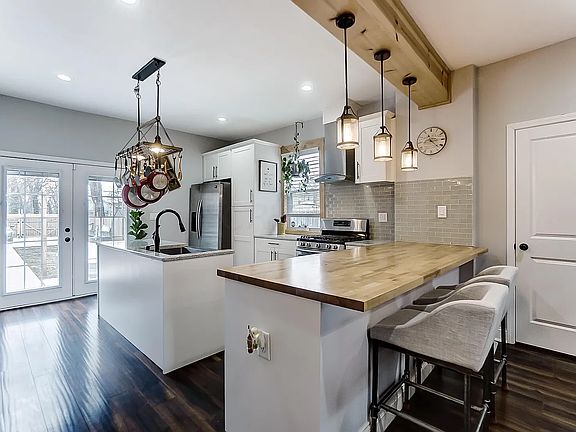 Butcher block islandThree good-size bedroomsFinished third-floor bonus roomSpacious move-in-ready homeStainless steel appliancesGranite countertopsStylish finishes